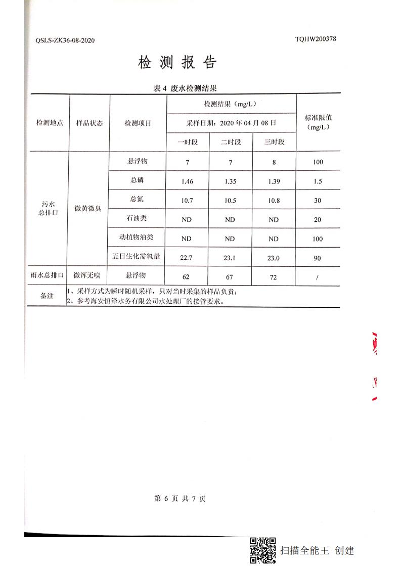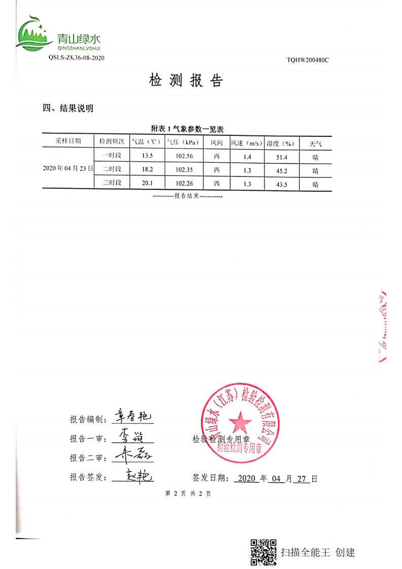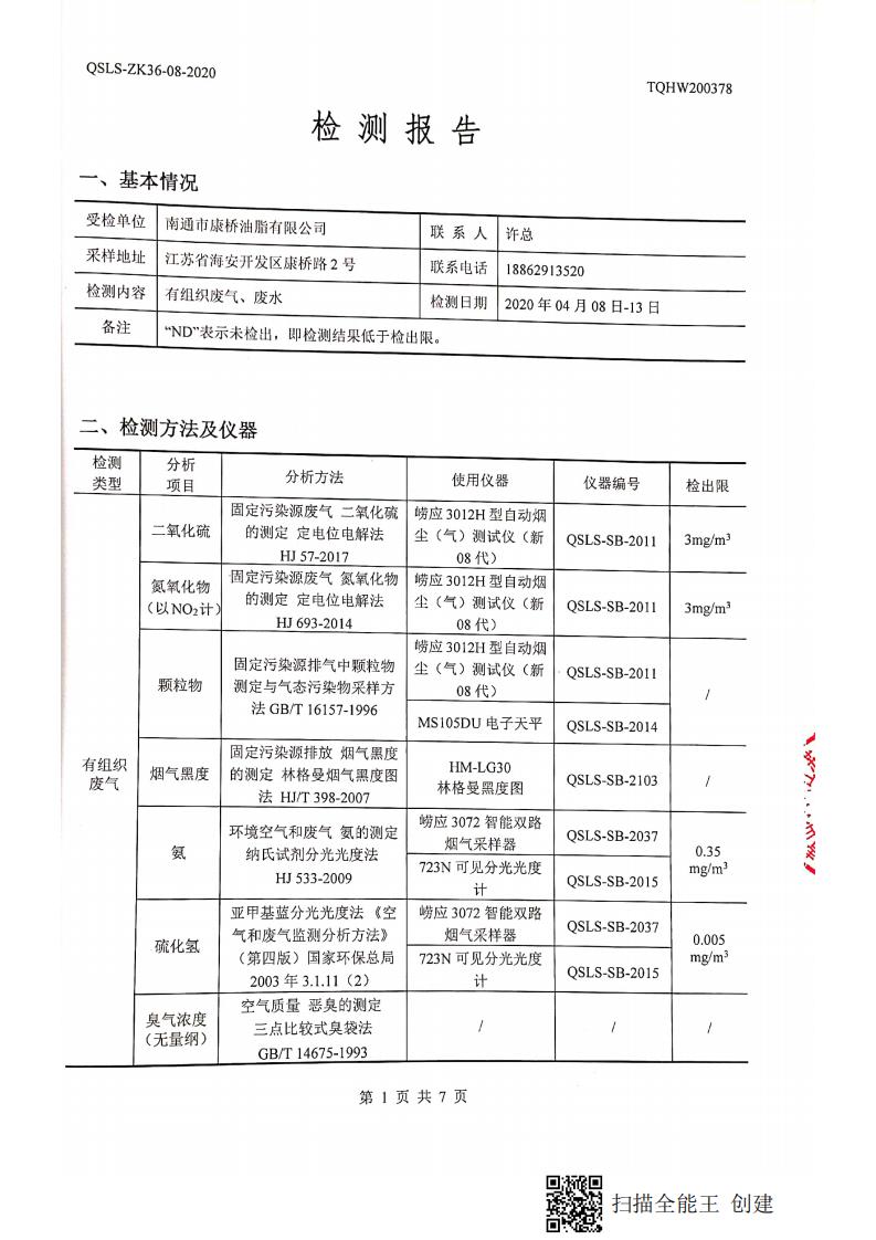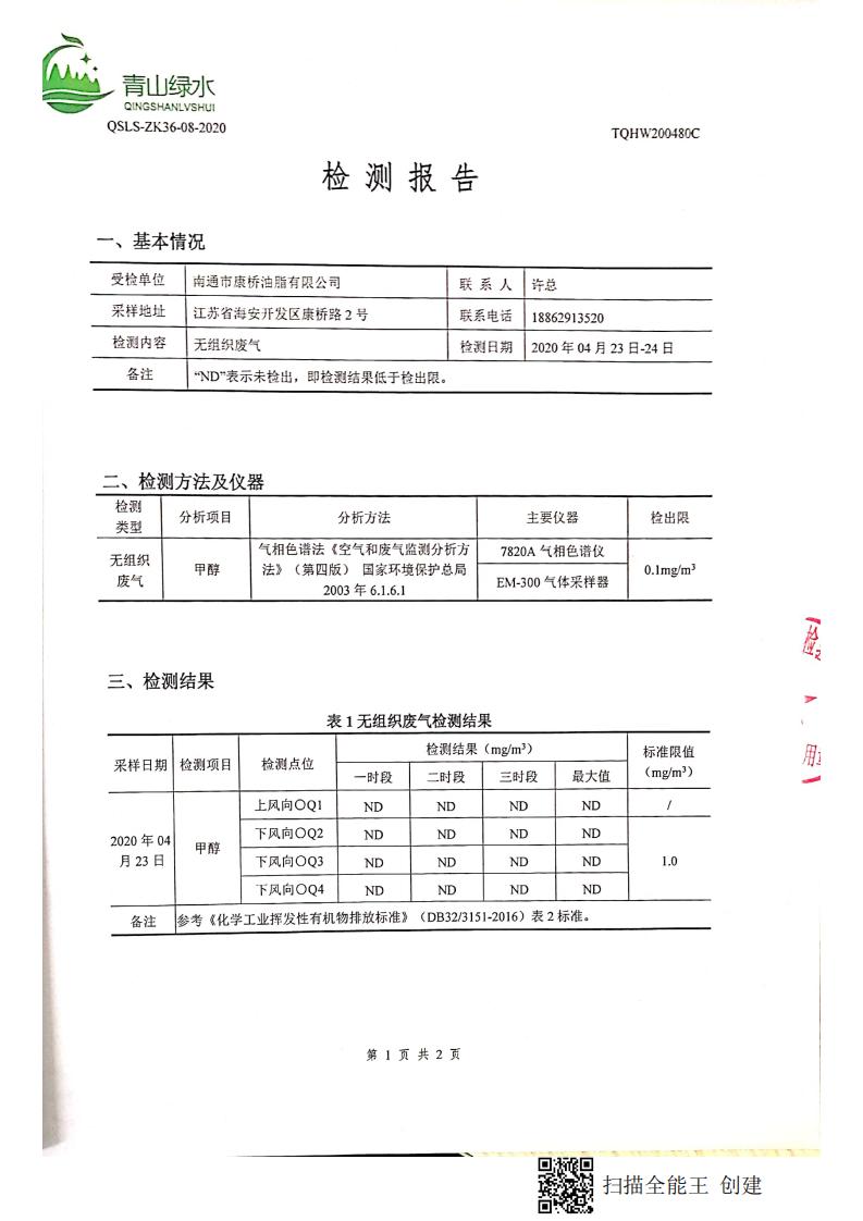 南通市康橋油脂有限公司4月份環(huán)境檢測(cè)報(bào)告